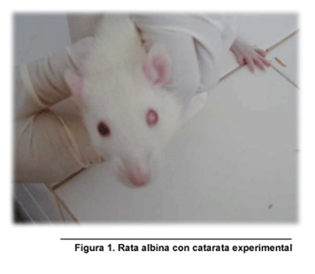 El cristalino ocular sano es un tejido transparente del ojo, que separa el segmento anterior con la córnea y el humor acuoso, del segmento posterior con el humor vítreo. La opacificación del cristalino se conoce como catarata ocular y afecta la visión hasta tal magnitud que constituye la primera causa de ceguera en el mundo. Es una afección oftalmológica incapacitante. En la Figura1 se muestra una rata albina con catarata experimental en el ojo izquierdo. Puede apreciarse el color blanquecino opaco en contraste con la transparencia que muestra un ojo normal rojo.