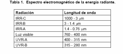 Si bien el sol es indispensable para la vida y la buena salud, también puede ocasionar efectos secundarios adversos. En la Tabla 1 se muestra la composición de una porción del espectro electromagnético de la energía radiante, según la CIE
