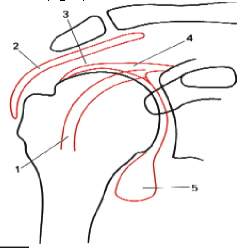 1.- Tendón de la porción larga del bíceps, 2.- Bolsa subacromial,