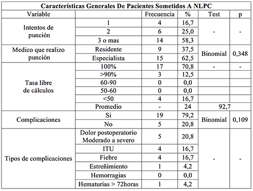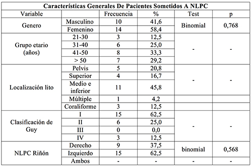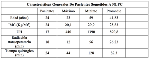 con 24 NLP realizadas; El 42% (10 pacientes) fueron del sexo masculino y el 58% (14 pacientes)