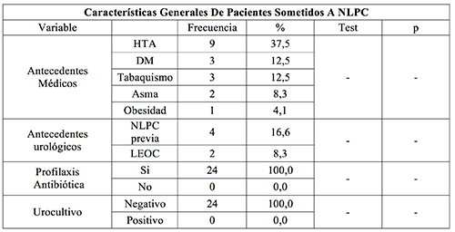 tabaquismo 12,5%. De los antecedentes urológicos de importancia el 16,6% (4 pacientes) tenían