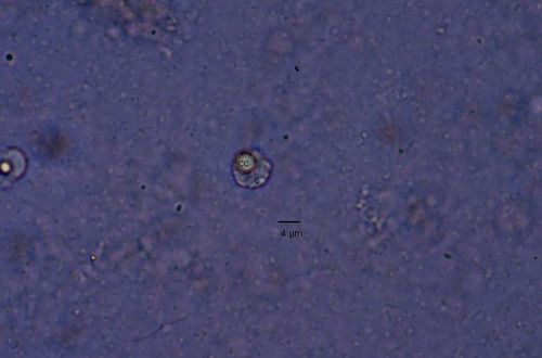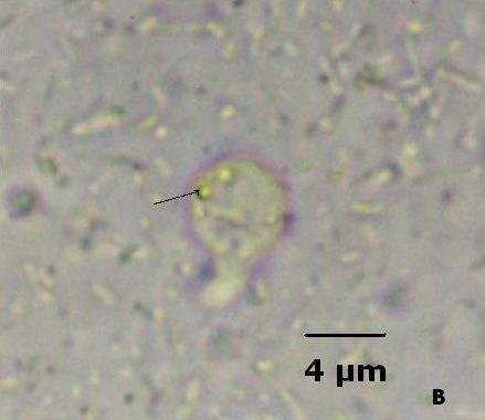El examen microscópico del sedimento del cultivo polixénico de B. hominis en el medio BDM, a las 24, 48 y 72 horas de incubación reveló el marcado polimorfismo previamente descrito para este organismo, observándose las formas con cuerpo central (FCC), forma granulosa (FGra), forma ameboide (FAmeb) y los quistes, además de una marcada variación en el tamaño de 4-30 µm. Con aumentos 400x y 1000x (Figura 1A), las FCC presentan forma redondeada u ovalada, 4-30 µm de diámetro, un organelo membranoso de gran tamaño denominado cuerpo central que puede ocupar entre 40- 75% del tamaño celular y su aspecto puede ser muy refringente o traslúcido.