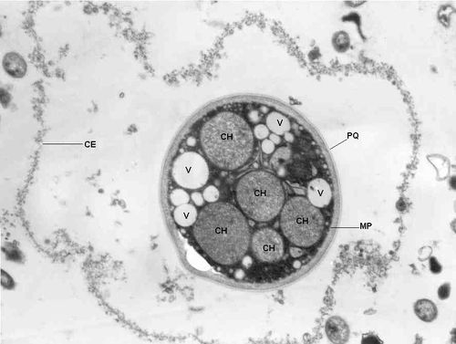 Fig.10.- B. hominis. Sedimento de cultivo polixénico en medio BDM, aislado B69:UCV. MET. Forma quística. Cubierta externa (CE) irregular constituida por material fibrogranular. Pared quística (PQ), gruesa con tres zonas bien definidas. La membrana plasmática no se identifica claramente por la elevada cantidad de gránulos electrodensos que hay en el citoplasma. El quiste presenta vesículas (V) vacías y cinco estructuras esféricas con membrana propia semejantes a células hijas (CH).