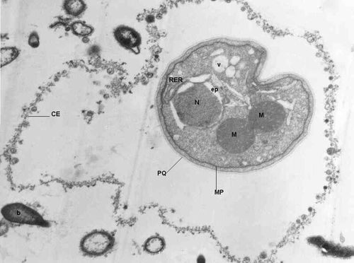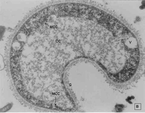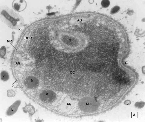 El cuerpo central (CC) tiene una membrana (MCC) aparentemente discontinua en algunas zonas, y puede o no contener material electrodenso como gránulos finos. En el citoplasma pueden verse núcleos (N) con un espacio perinuclear (ep), 1-3 mitocondrias (M), Retículo Endoplásmico Rugoso (RER), Retículo Endoplásmico Liso (REL), Aparato de Golgi (AG) y ribosomas libres (R). El núcleo presenta la membrana nuclear (MN) con poros (p), característica de los eucariontes. Las mitocondrias varían en número, forma y tamaño, dentro de una misma célula y en una misma cepa. Están localizadas cerca del núcleo. Presentan forma circular, tubular o vesiculosa, con elevada electrodensidad y crestas abundantes o escasas que se ven como espacios claros. El retículo endoplásmico, presenta una estructura sacular simple o múltiple, de electrodensidad moderada y puede o no tener ribosomas adheridos. El aparato de Golgi está constituido por estructuras vesiculares múltiples, localizado muy cercano al núcleo y las mitocondrias. En el citoplasma hay vesículas libres con membrana sencilla, inclusiones electrodensas y ribosomas libres (Figura 2B).
