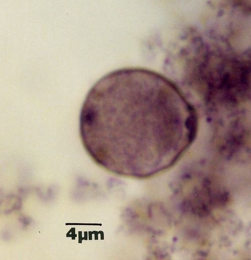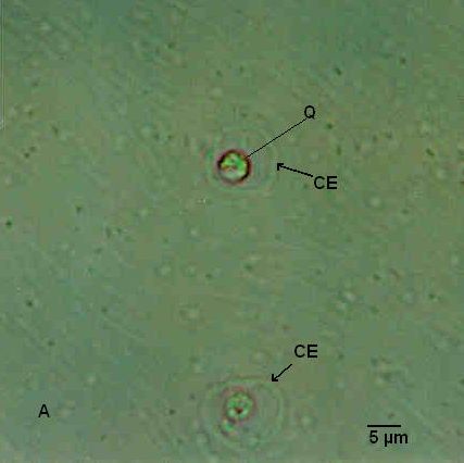Fig. 8A.- B. hominis. Sedimento de cultivo polixénico en medio BDM, aislado B69:UCV. Quistes con cubierta. Examen en fresco. 100x. Tamaño del quiste 5µm y diámetro de la cubierta externa 10µm. La cubierta externa (CE) es fina y se observa el espacio vacío entre ésta y el quiste (Q) el cual es muy refringente.