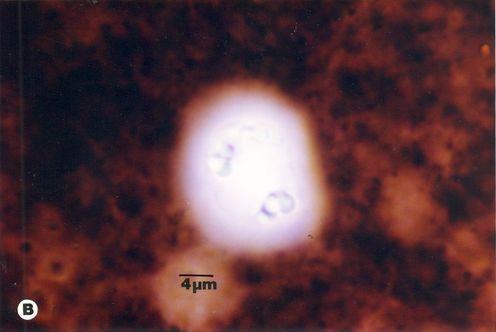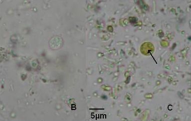 Fig.8B-C.- B. hominis. Sedimento de cultivo polixénico en medio BDM, aislado B69:UCV. Quistes desnudos. 100x. B.- Examen en fresco. Se observan estructuras esféricas refringentes. C.- Con solución de Lugol, las estructuras esféricas no se colorean y en el centro se ve una vacuola de glucógeno pequeña (señalada con la flecha). En las preparaciones teñidas con lugol se destacan en el interior cierta cantidad de estructuras esféricas prominentes, entre las cuales pudiera encontrarse el núcleo, pero con esta coloración es difícil identificarlo. Además pueden verse pequeñas vacuolas de glucógeno (Figura 8C). La cubierta externa de los quistes, ultraestructuralmente se observa constituida por material fibrogranular y dentro está el quiste propiamente dicho, cuya pared presenta de afuera hacia dentro una capa externa, fina y filamentosa, una banda intermedia electrón opaca y una capa interna homogénea, en contacto con la membrana celular (Figura 9). Hay quistes con organelos citoplasmáticos similares a las formas vegetativas, con el núcleo rodeado del espacio perinuclear y la cromatina dispuesta en la periferia, las mitocondrias redondeadas con pocas crestas, AG, RER y gran cantidad de ribosomas libres (Figura 9).