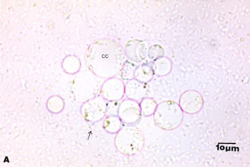 Las FGra al microscopio de luz (Figura 3A, 3B) son similares a las FCC pero tienen el cuerpo central lleno de gránulos.