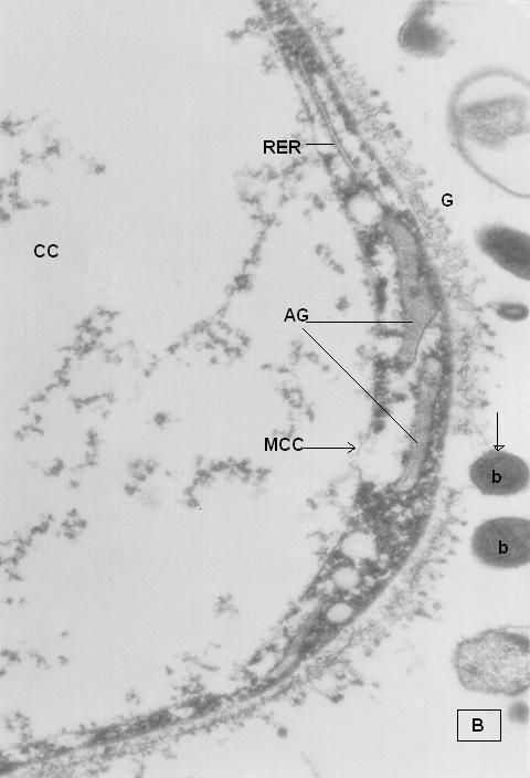 Fig. 2B.- B. hominis. Sedimento de cultivo polixénico en medio BDM, aislado B69:UCV. MET. Ampliación: Región del citoplasma con retículo endoplasmático rugoso (RER), Aparato de Golgi (AG), la flecha señala una bacteria (b) adherida al glicocalix (G) y una zona donde la membrana del cuerpo central (MCC) es discontinua.