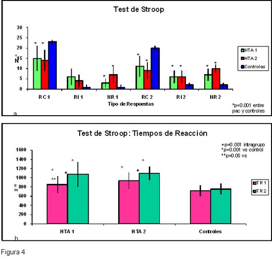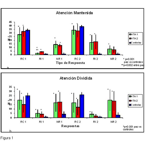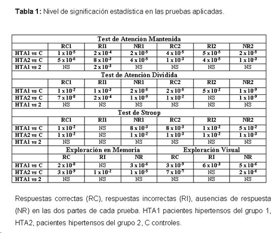 La Hipertensión Arterial (HTA) puede producir alteraciones cognitivas, por lo que se estudiaron rasgos de la cognición de pacientes hipertensos sin complicaciones somáticas ni neurológicas. 84 pacientes integraron dos grupos de acuerdo con su presión arterial sistólica (PAS) y diastólica (PAD): G1 (PAS=140-159; PAD=90-99), y G2 (PAS≥160; PAD≥100) vs controles sanos y se les aplicaron pruebas de atención, de memoria, el Test de Stroop y el de Clasificación de Cartas de Wisconsin (WSC). Los pacientes tuvieron menos respuestas correctas, más errores, más ausencias de respuestas y tiempos de reacción más prolongados que los controles en las pruebas de atención, memoria y Stroop y completaron menos categorías y tuvieron más errores que los sanos en el WSC. Se concluye que la HTA produce alteraciones cognitivas detectables en etapas asintomáticas de la enfermedad expresadas como un trastorno funcional predominantemente frontal, probablemente vinculado a la hipoperfusión cerebral crónica que produce la enfermedad.
