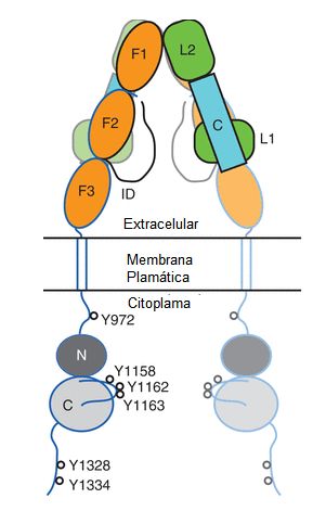 extracelular se une a la insulina (la unión de la insulina ocurre en un dímero